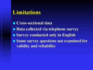 there were some limitations in this study… This was a cross sectional study- causal relationships can not be inferred also doesn’t account for seasonal variations in PA.All data was self-reported and not measured objectively. Also, as the survey was conducted in English-all non-english speaking residents were excluded. (including a large, population of Asians and Latinos) Finally, whenever possible questions were taken directly from the BRFSS. However some items were not systematically analyzed for (psychometric properties) validity and reliability. |