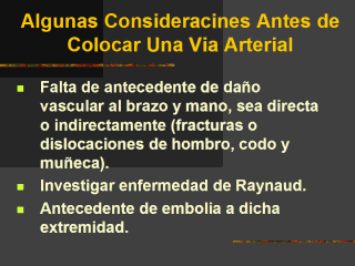 antes de decidir colocar una arteria radial para monitorización: - Falta de antecedente de daño vascular al brazo y mano, sea directa o indirectamente (fracturas o dislocaciones de hombro, codo y muñeca). - Investigar enfermedad de Raynaud. - Antecedente de embolia a dicha extremidad. Este método debe usarse con precaución en aterosclerosis de la arteria braquial, sus ramas o ambas cosas. |