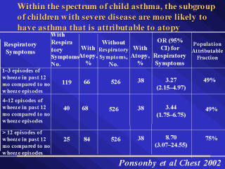 | We conducted a cross-sectional study of child asthma in the Australian Capital Territory in 1999-2000 to examine the contribution of atopy to various indicators of asthma frequency and severity. The proportion of children with atopy, hay fever or eczema increased with increasing wheeze frequency over the past year. |