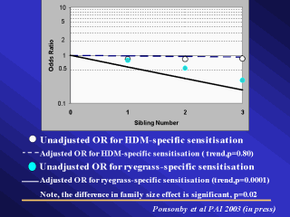 HDM-specific and ryegrass-specific sensitisation was significant (p=0.02). The observation that larger family size had a clear protective effect for ryegrass-specific sensitisation but not HDM-specific sensitisation, if confirmed in other work, suggests that the apparent protective effect of high sibling number does not occur to the same extent for all allergens. The main strength of this study was the delineation of mutually exclusive sensitisation outcomes, allowing a clearer assessment of the effect of family size on allergen-specific sensitisation without any possible contamination due to concomitant sensitisation to other allergens. |