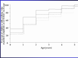 Age of onset of asthma or wheezy breathing by synthetic bedding use at 1 month of age. Log-rank test for equality of survivor function, P=0.03. Solid line indicates synthetic pillow and quilt; dotted line indicates no synthetic pillow or quilt; heavy broken line indicates synthetic pillow, not quilt; light broken line indicates synthetic quilt, not pillow.