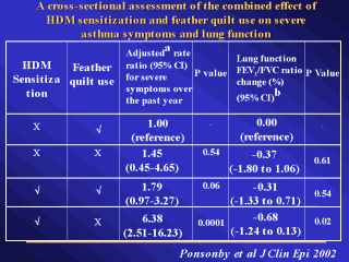 forced vital capacity. a Adjusted for child exposure to active smoking in same room and home gas appliance use. bAdjusted for sex, height, season of test, research technician, child exposure to tobacco smoke and home gas appliance use.Compared to non-HDM allergic children with feather quilts, children with the combination of HDM allergy and non-feather bedding (predominantly synthetic) were substantially more likely to have severe wheeze and a reduction in lung function. |