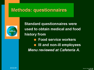 | Standard questionnaires were used to obtain medical and food history from food service workers and ill and non-ill employees. The menu of Cafeteria A was reviewed for the day in question. |