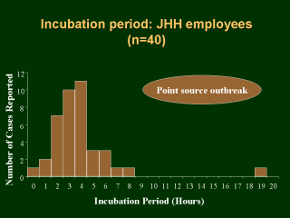 | The incubation period was between 15 minutes to 19 hours, the mean being 4 hours. If we excluded the one outlier, the incubation period was between 15 minutes to 8 hours. Thus, the disease was of a short incubation period. |