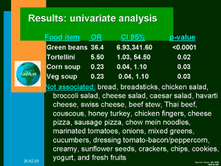 | The results of the univariate analysis indicated that the odds ratio for green beans was 36.4 which was statistically significant, with a rather wide 95% confidence interval. Tortellini had an odds ratio of 5.5 which was not statistically significant and corn soup and vegetable soup had a protective affect. None of the other foods served at Cafeteria A were statistically associated. |