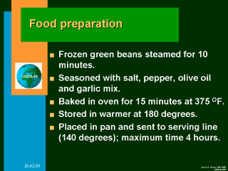 | Here we feel that it is important to review the food preparation of green beans. The frozen green beans were first steamed for 10 minutes, then seasoned with salt, pepper, olive oil and garlic mix. This was followed by 15 minutes of baking at 375 degrees Fahrenheit. The green beans were then stored in a warmer at 180 degrees, placed in a pan and sent to the serving line (140 degrees), where they were served rather quickly, as most of the lunch items had a side order of green beans. |