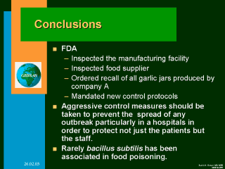 | In conclusion I would like to say that aggressive control measures should be taken to prevent the spread of any outbreak in a hospital in order to protect not just the patients but the staff. And rarely bacillus subtilis has been associated in food poisoning. |