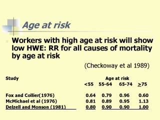 | Age at risk means the age at any point in follow up that shows the outcome (death). Increasing age at risk will increase the period of follow-up. And thus reduce the HWE. An example is the following studies. |