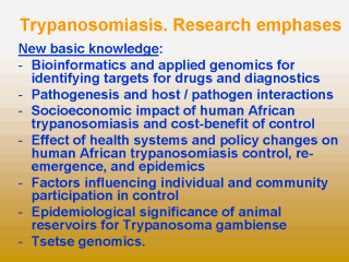 cure. New intervention methods: a) Clinical-epidemiologic significance of the direct and indirect agglutination test for the trypanosome. b) Evaluation of the short duration treatment with pentamidina, suramin and melarsoprol. c) Investigation on melarsoprol-resistance. New strategies: Sustainable and community based control on Tsetse fly. |