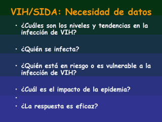 que la prevalencia de la infección por VIH comienza a aumentar. Los datos de la vigilancia proporcionan la información que necesitan los modelos para hacer las estimaciones nacionales de infección y proyectar los casos de enfermedad y muerte que inevitablemente surgirán. |