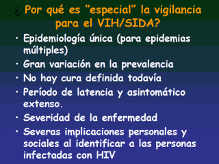 | Mientras se usan las herramientas epidemiológicas tradicionales para la vigilancia de VIH, los rasgos especiales de la epidemia de VIH requieren de una atención especial y plantean desafíos especiales a las actividades de vigilancia. |