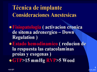 La inducción anestésica puede comprometer aún más el estado de depresión miocárdica de fondo. El manejo anestésico en términos generales no difiere mucho del que se utiliza para cirugía cardíaca o no cardíaca de cualquier paciente con miocardiopatía en fase terminal. La principal diferencia en el manejo de estos pacientes miocardiopáticos consiste en que como el corazón del receptor ya no se va a utilizar más después del trasplante, se debe usar drogas que aumente su función antes del bypass cardiopulmonar, con el fin de optimizar la función de otros órganos (cerebro, riñones, etc) y controlar la hipertensión pulmonar. Muchos tipos de agentes anestésicos intravenosos han sido utilizados para la inducción anestésica. Para los primeros trasplantes, el tiopental sódico fue el más utilizado. Recientemente muchos anestesiólogos están utilizando la inducción de secuencia rápida con ketamina o etomidato. Sin embargo, la "down-regulation" de los receptores adrenérgicos pueden teóricamente desenmascarar las propiedades inotrópicas negativas de la ketamina. En un estudio randomizado se observó que la ketamina a dosis de 1,5 mg/kg incrementó la presión arterial media en un 28%, pero con un 109% de incremento en la presión venosa central y un 85% de aumento en la presión capilar pulmonar. A pesar de que no se reportaron efectos adversos significativos, la evidencia de este estudio sugiere que la ketamina debe ser utilizada en forma cautelosa en el trasplante cardíaco. En otro estudio se encontró que el etomidato, pero no el midazolam fue aceptable para la inducción anestésica en trasplante cardíaco. Otros anestesiólogos prefieren el uso de opioides a altas dosis con o sin benzodiacepinas. Esta técnica fue usada en al menos 2/3 de las instituciones en 1986. Se ha utilizado la técnica de la inducción por secuencia rápida con o sin la compresión cricoidea. La dosis de los fármacos debe reducirse, debido al tiempo prolongado de circulación, el menor volumen de distribución y la depresión de la respuesta farmacodinámica. En general, la mayoría de los receptores cardíacos toleran bien la inducción anestésica. Se ha sugerido que cuando ocurre disfunción ventricular, es principalmente una consecuencia del incremento de la resistencia vascular sistémica y pulmonar. Esto se refleja por un aumento de la presión venosa central. La perfusión coronaria puede reducirse en respuesta a una reducción del volumen de eyección en estos pacientes. A pesar de que los agentes inhalados son menos comúnmente utilizados, presumiblemente por sus efectos miocardiodepresores, en los estudios retrospectivos no se han notado mayores diferencias en comparación con la técnica con opioides. Los agentes inhalados han sido asociados con una mayor frecuencia de hipotensión, pero las arritmias son más frecuentes en los pacientes trasplantados de corazón que fueron anestesiados con la técnica de opioides como mantenimiento. No parece haber diferencias entre el fentanil y el sufentanil en el trasplante cardíaco. La reducción de la depuración de opioides debido a una disfunción hepática intrínseca o hipoperfusión hepática teóricamente puede incrementar la incidencia de ventilación mecánica postoperatoria prolongada con el consecuente mayor riesgo de infección; sin embargo, esta posibilidad no parece ser un problema. A pesar de que el óxido nitroso ha sido utilizado para la anestesia en el trasplante cardíaco, por lo general se evita su uso debido al potencial de miocardiodepresión e incremento de la presión pulmonar. En resumen, la elección del agente anestésico parece ser menos importante que la habilidad para controlar el estado hemodinámico de esta población de pacientes con reserva limitada. El manejo del bypass cardiopulmonar en estos pacientes no es diferente, excepto que el recalentamiento es usualmente prolongado, debido al enfriamiento más profundo del corazón del donante y el tiempo de isquemia, que es más prolongado que las cirugías cardíacas usuales. El corazón trasplantado es controlado por el nodo sinoatril del donador, el cual es excluido de la inervación autonómica normal. A pesar de que una segunda onda P del receptor puede ser observada en el electrocardiograma, ésta no es funcional. Típicamente el corazón trasplantado desarrolla una bradicardia sinusal o bloqueo atrioventricular. Por lo tanto, el soporte cronotrópico es esencial para el manejo de estos pacientes. La entrega de oxígeno depende principalmente de la frecuencia cardíaca en estos pacientes, debido a que el volumen de eyección es fijo. Se puede utilizar un marcapaso temporal ventricular para controlar la frecuencia cardíaca; pero por lo general se usa el isoproterenol o la dobutamina en el soporte postoperatorio, debido a que estas drogas tienen además la capacidad para incrementar la contractilidad miocárdica y reducir la presión pulmonar. Aún en ausencia de hipertensión pulmonar en el receptor en la fase preoperatoria, la disfunción ventricular derecha puede desarrollarse en la fase post-bypass cardiopulmonar. Esta falla ventricular derecha por lo general es autolimitada y se resuelve en un lapso de varios días. El manejo clínico de la falla ventricular derecha no difiere mucho de otros pacientes. Las prostaglandinas como vasodilatadores pulmonares son útiles en este grupo de pacientes, al igual que la amrinona. Las consecuencias de la desnervación cardíaca son varias. La respuesta a los agonistas adrenérgicos â directos no varía cualitativamente. De hecho, la respuesta al isoproterenol puede estar incrementada debida a la "up-regulation" de los receptores. Por el otro lado, la respuesta cardíaca a drogas que liberan indirectamente catecolaminas (p.ej., tiramina, dopamina, efedrina, metaraminol, mefentermina, etc), está disminuida pero no abolida. Las drogas con efectos anticolinérgicos (p.ej., atropina, pancuronio) no tienen efectos en 