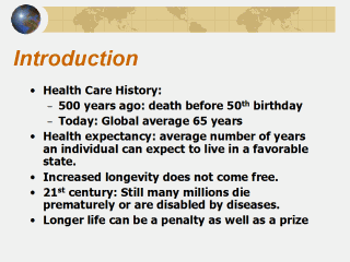 65 years in 1996. Health expectancy can be defined as life expectancy in good health, and amounts to the average number of years an individual can expect to live in a favorable state. It is vital to realize that increased longevity does not come free. Every year many millions die prematurely or are disabled by diseases and conditions that are to a large extent preventable. Longer life can be a penalty as well as a prize. |