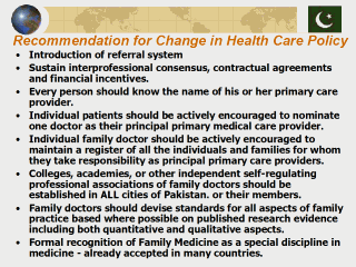 agreements and financial incentives. Every person should know the name of his or her primary care provider. Individual patients should be actively encouraged to nominate one doctor as their principal primary medical care provider. Individual family doctor should be actively encouraged to maintain a register of all the individuals and families for whom they take responsibility as principal primary care providers. Colleges, academies, or other independent self-regulating professional associations of family doctors should be established in ALL cities of Pakistan or their members. Family doctors should devise standards for all aspects of family practice based where possible on published research evidence including both quantitative and qualitative aspects. Formal recognition of Family Medicine as a special discipline in medicine - already accepted in many countries. |