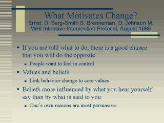 about what is important than to just tell them what to do. The experienced professional can guide the patient to state the positive reasons for attempting behavior change; this is much more powerful when said for oneself than when coming from another. |