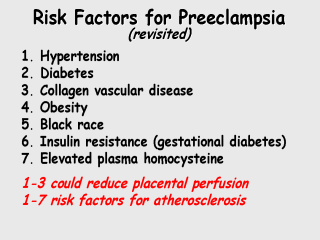 | If you look at the general risk factors you come up with some interesting conclusions. First of all, I mentioned that a lot of these things could reduce placental perfusion. But I can’t figure out why being black or having insulin resistance or elevated plasma homocysteine, all of which predispose you to preeclampsia, would reduce your placental blood flow. But what is interesting is you’re really writing down a list of risk factors for cardiovascular disease late in life. |