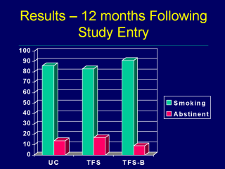 | This bar graph represents the percentage of subjects in each group who self-reported smoking or abstinence following the delivery of the 8 week intervention. There were no statistically significant differences between smoking behavior and treatment groups. |