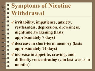 We should explain that symptoms of Nicotine withdrawal will stop during 7-10 days.