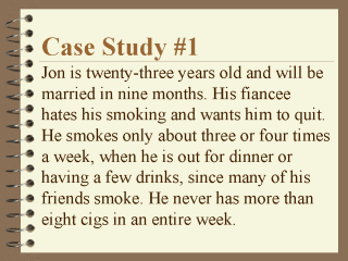 Study #2 Julie is three months pregnant and wants to quit smoking. She has tapered down to eight cigs a day but just can’t seem to cut down any more. She smokes mostly in the evenings because she can’t think of much else to do. She can no longer smoke at work, and that has not been a problem for her.