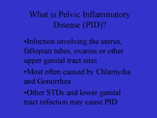 | PID is an infection that involves the uterus, the fallopian tubes – any of the upper genital tract structures. We think that the way that it occurs etiologically is that women become infected by either Gonorrhea or Chlamydia through their cervix, which is considered to be the lower genital tract, and then these organisms ascend into the upper gential tract and cause the diseases. |
