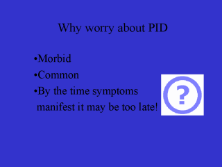 | Why do we worry about PID? It is a morbid condition that relates to a lot of long-term adverse outcomes. It’s also common. And by the time the symptoms manifest it may be too late. This construct is something that we’ve believed for a long time; our research is beginning to question whether it’s true or not. |