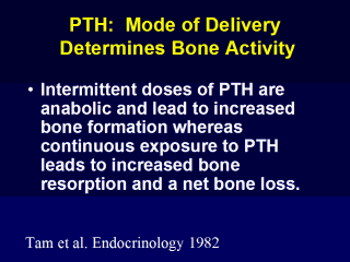 Daily injection of PTH increased bone apposition rate without an increase in bone resorption, resulting in a net increase in trabecular bone volume. Continuous administration of PTH increased both bone formation and resorption, with a net decrease in trabecular bone volume. Tam CS, Heersche JNM, Murray TM and Parsons JA. Parathyroid hormone stimulates the bone apposition rate independently of its resorptive action: Differential effects of intermittent and continuous administration. Endocrinology 1982;110:506-512. |