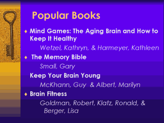 healthy. The Memory Bible. Gary Small is a physician but using the word bible and memory together I think has a lot of connotations for our culture.The Memory Bible does present a lot of legitimate coping strategies – things to do about memory and memory changes. I kind of bristled at calling it a bible; it just seemed like it was supposed to be the final answer, but there is some good stuff in there. Keep Your Brain Young. Brain Fitness. We want to apply the expertise from our exercising friends now to the brain. Keep Your Brain Young is a fairly tempered description of a wide variety of coping strategies, healthy lifestyle issues, everyday memory strategies that people can use without a lot of training and expertise that made some sense. |