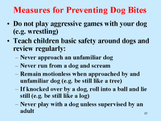 dogs or dogs displaying unusual behavior to an adult -Avoid direct eye contact with a dog -Do not disturb a dog who is sleeping, eating or caring for puppies -Do not pet a dog without allowing it to see and sniff you first I-f bitten, immediately report the bite to an adult |