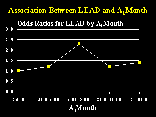| For lower extremity arterial disease an initial increase in risk by A1months is seen up until 800 A1months. However, after that the relationship appears to disappear. Further statistical analyses did suggest that hemoglobin A1 is a predictor of LEAD in Type 1 diabetes in this EDC cohort. |