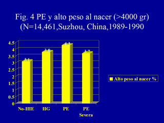 Esta figura muestra que la incidencia de alto peso al nacer es más alta entre mujeres con PE, PE severa y HG que en mujeres sin HIE.