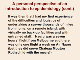 We surveyed 100 people on the first day. We were absolutely amazed that 33 of those 100 had results consistent with diabetes. Pincus was absolutely convinced it was something to do with the incorrect dilutions of the glucose loads or that the blood glucose methodology was flawed. So convinced of this, he decided it was time to return to Melbourne that day leaving me on the island with the local team and a laboratory assistant from Melbourne. Well, on the second day another 33 out of 100 had diabetes and so it went and we ended the survey with figures (18) that almost rivalled the then highest diabetes prevalence in the world, the Pima Indians.