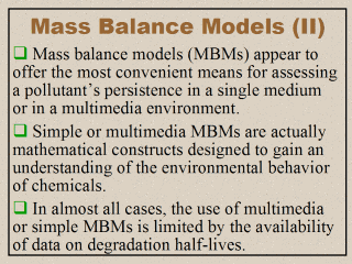 In all cases, the use of simple or multimedia MBMs is often limited by the availability of data on degradation half-lives. For students interested in this type of modeling, they should start with the textbook by Mackay (2001), and with the work by Wania and Mackay (2000) on comparing the overall persistence values calculated by various multimedia models.