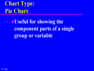 proportional contribution of each component part. The use of different colors or shadings for each slice makes it easier to distinguish between the slices. Percentages for the slices should be included to aid the reader in making comparisons. It is difficult to compare components between 2 or more pie charts. If you want to compare components of more than one group or variable use a 100% component bar chart. |