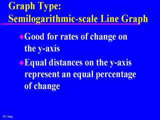 one order of magnitude greater than the one below it. Values in each cycle are 10x greater than those in the preceding line. Useful when you have to fit a wide range of values on a single graph. Interpretation: Sloping straight line - constant rate (not amount) of increase or
