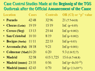 but perhaps unavoidable in the midst of the epidemic outbreak. Despite this potential bias the results were very similar in all the studies, thus enhancing the belief that oil was the causative agent of the disease and being this fact accepted by a great majority of researchers. Doll R. The aetiology of the Spanish Toxic Syndorme: Interpretation of the epidemiological evidence. World Health Organization, editor. Copenhagen. 1985; Report nr SPA/CEH 502. 1 p. Diaz de Rojas F, Castro Garcia M, Abaitua Borda I, et al. The association of oil ingestion with toxic oil syndrome in two convents. Am J Epidemiol 1987;125(5):907-11. Canas R, Kilbourne EM. Oil ingestion and the toxic-oil syndrome: results of a survey of residents of the Orcasur neighbourhood in Madrid, Spain. Int J Epidemiol 1987;16(1):3-6. |