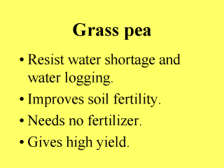 | Grass pea (Chickling pea) is a hardy legume that is cultivated by several hundred million farmers in the Indian subcontinent and sub-Saharan Africa for food during times of food shortages as in drought and flooding. It is a friendly legume for the peasants who will rely on it for food during famine. |