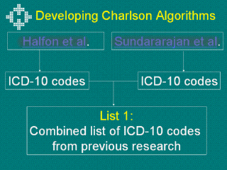 Three separate lists were generated for the ICD-10 Charlson comorbidities, eventually combined to form one complete list. The following three slides demonstrated the development of each list.