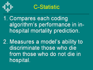 The C-statistic was "used to compare the performance of each coding algorithm in predicting in-hospital mortality. The C-statistic is a measure of a model's ability to discriminate those who die of those who do not die in hospital." p.1132