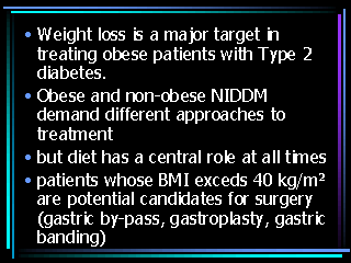 Management of the obese diabetic patients should combine strategies which aim at reducing weight excess, lowering chronic hyperglycaemia and correcting other risk factors. |