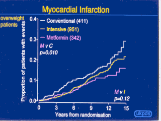 | Metformin significantly better than conventional treatment in reducing risk of myocardial infarction. Metformin has additional nonglycaemic benefits on coronary heart disease and significant benefits for microvascular disease. |