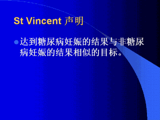 1990年签署了Saint Vincent声明(SVD)。这一声明由糖尿病专家,卫生保健专家以及一些欧洲国家的政府共同签署的。SVD制定了包括降低糖尿病导致的失明,截肢,冠心病在内的一系列目标。一个公开的目标是糖尿病妊娠的结果应当与非糖尿病妊娠的结果相似。当时,SVD签署的时候,并没有基于人口的糖尿病妊娠结果的记录。但是,基于当时了解状况的目的似乎是已经达到了的。