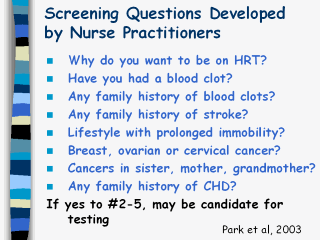 | A group of nurse practitioners developed 8 screening questions to determine which women would benefit the most by being offered genetic testing for the Factor V Leiden mutation. Those who answer yes to questions 2 through 5 may be candidates for genetic testing. |