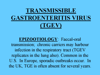 occurs as two forms: Epizootic: Infection follows the entrance of virus into a non-immune herd. Symptoms develop very quickly and the disease spreads very rapidly (explosive infection). Older animals show anorexia, lethargy, diarrhoea, weight loss and vomiting. They recover in 1 week but in very young animals, mortality approaches 100%. Enzootic: The herd is persistently infected. Immune sows provide lactogenic immunity (IgA in milk) to the sucklings. Animals often have diarrhoea 1-2 weeks after weaning as maternally derived antibody declines. Clinical signs are similar but less severe than fully susceptible pigs. Similar pattern to rotavirus infection. |