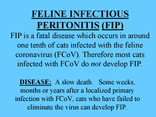 are recognised: Effusive (wet): Typical symptoms are chronic weight loss, depression, anorexia, fever and progressive abdominal enlargement caused by peritoneal and/or pleural effusions - fluid is clear to slightly opaque and very viscous with fibrin strands and often clots when exposed to air. There may be small necrotic lesions on the peritoneum and pleural surfaces. Non-effusive (dry): Clinical signs are more variable making this difficult to diagnose. Most have ocular abnormalities (eg corneal precipitates, bleeding into front of eye, iritis, colour change of iris) Disseminated pyogranulomatous lesions are found in major organ(s) - kidneys, liver, CNS, eyes. If a cat is ill and the reason is difficult to determine, dry FIP should be suspected. Combinations of effusive and non-effusive. |