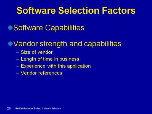 The software selection matrix will help you compare software capabilities. However, there are other factors which go into selecting a vendor and software. If you choose open source software, you may have a choice of several vendors who can support that software. This will give you more options for the present and also for the future where the initial vendor may not be performing well. You can then replace the vendor with another who is also familiar with the software but may be more responsive to your needs.