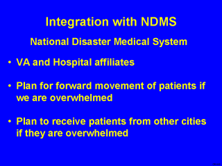 military-based networks known as the National Disaster Medical System. This system is designed to handle mass casualties from battlefields, as well as domestic disasters, like earthquakes that may destroy or otherwise overwhelm local medical systems. Fortunately, the VA Hospital in Pittsburgh is responsible for coordinating regional NDMS responses and has conducted annual exercises at Pittsburgh International Airport to test capabilities to both send and receive patients. |