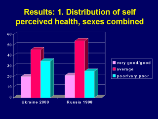 wanted to examine in this study, starting with the distribution of health. - 1/5 rate their health as good/very good - Just under ? as average - 1/3 as poor/very poor This indicates that Ukrainians have even worse levels of self perceived health than Russians and considerably worse than western European countries where generally <10% report poor/very poor health [NB The worse levels compared with Russia could reflect the bleaker economic situation in Ukraine compared with Russia (GNP in Ukraine was approx. $1000 per capita compared with $2300 in Russia in 1998) and the further economic decline since the 1998 Russian Survey was conducted] |