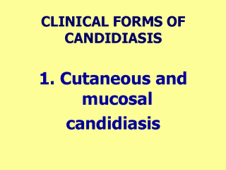 Oral trush, oezophagitis (AIDS patients, diabetic patients, patients on corticosteroid therapy, T-cell deficiency); vulvovaginal infection (diabetes, pregnancy, antibiotic therapy); cutaneous candidiasis (skin trauma, burns, maceration); onychomycosis; mucocutaneous candidiasis in SCID patients.