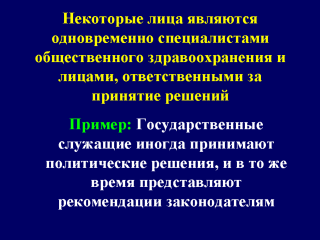 are both practitioners and decision-makers Example: a state health officer sometimes makes policy decisions but functions as a practitioner when he/she provides advice/recommendations for legislation |