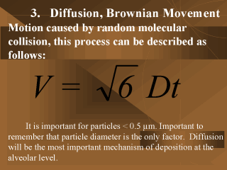 time, t D = Diffusion coefficient of particles which is expressed as follows: T = Temperature, Kelvin k = Boltzmann constant (1.38 ? 10-6 ergs/K)n = Gas viscosity d = Diameter of particle |